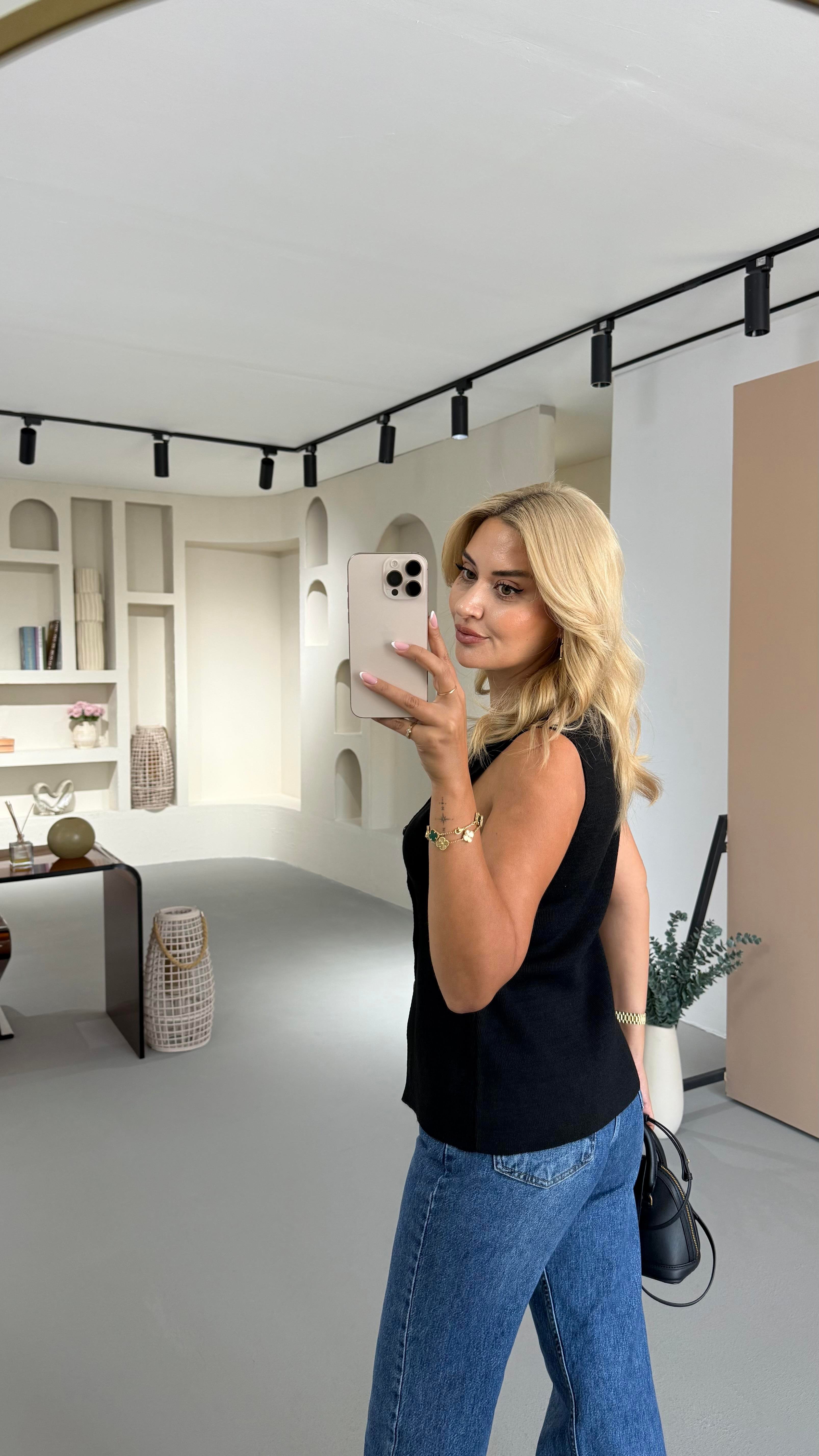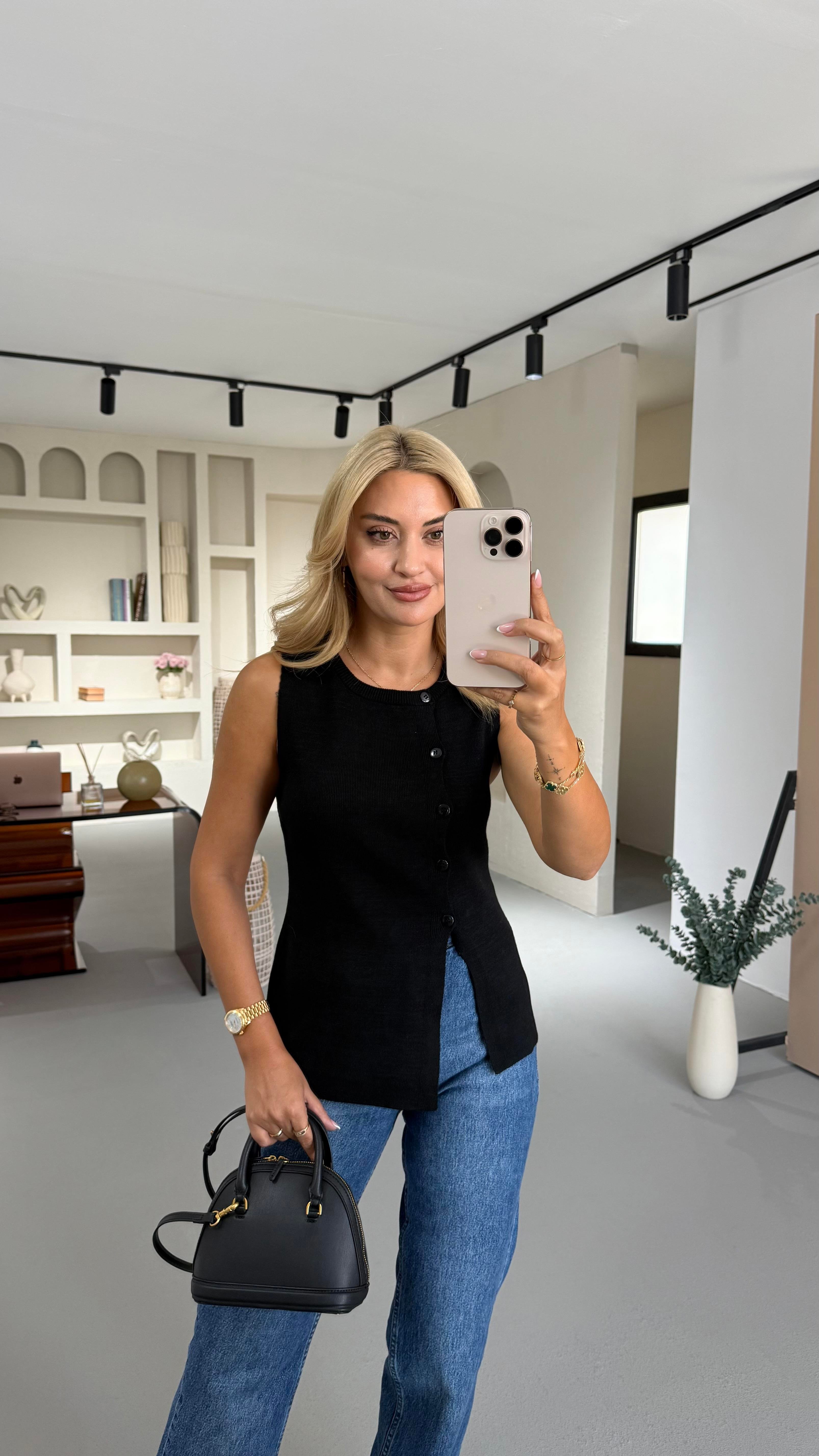 Yandan Düğmeli Siyah Çelik Triko Yelek