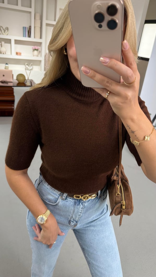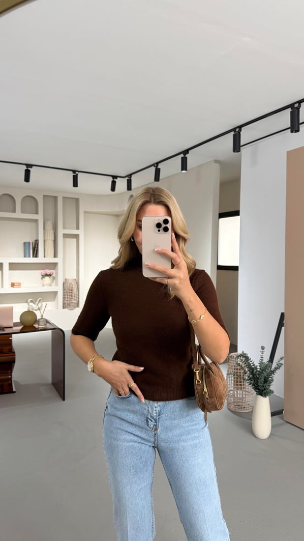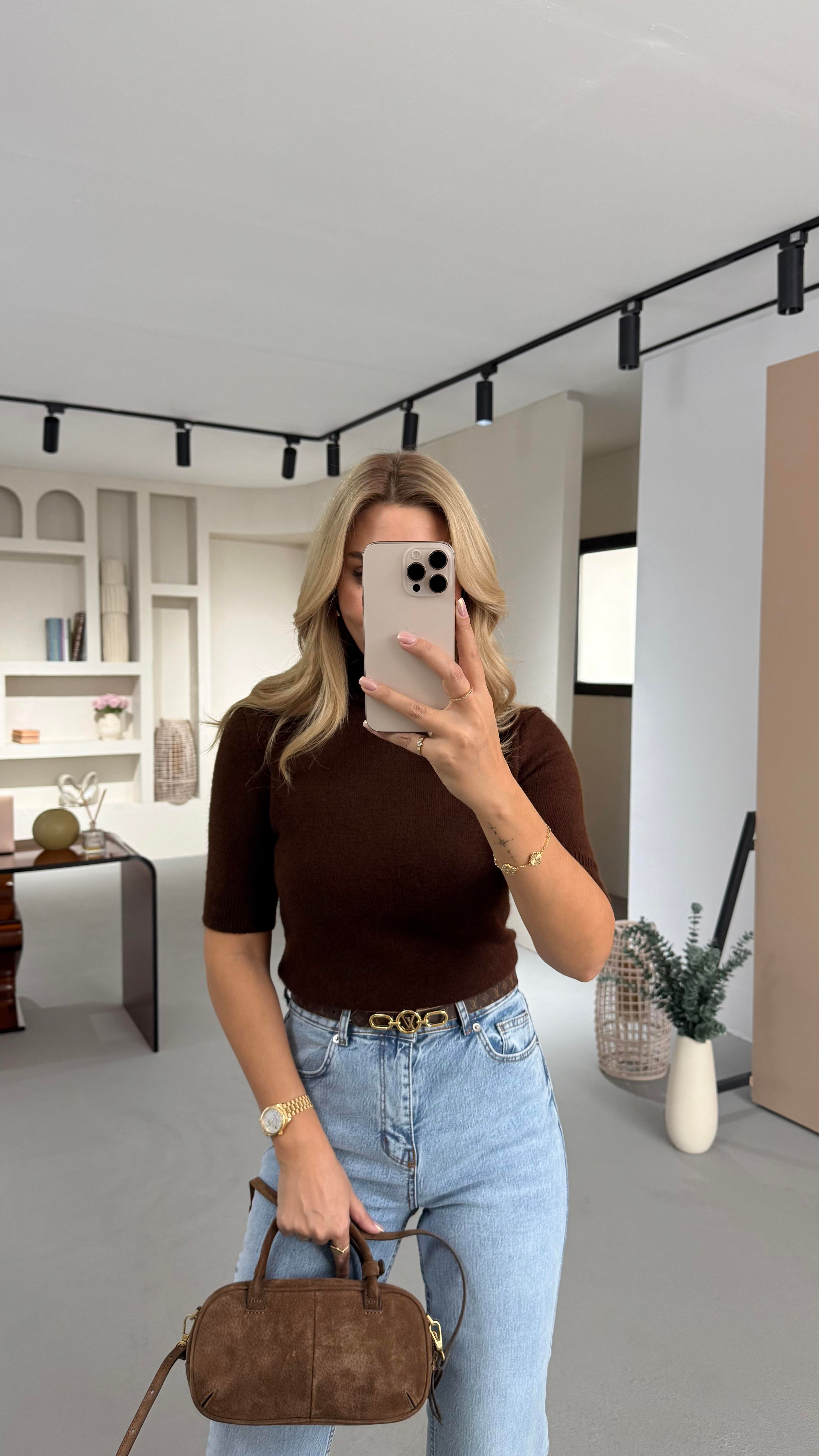 Yarım Balıkçı Kısa Kol Yumuşak Doku Acı Kahve Kazak