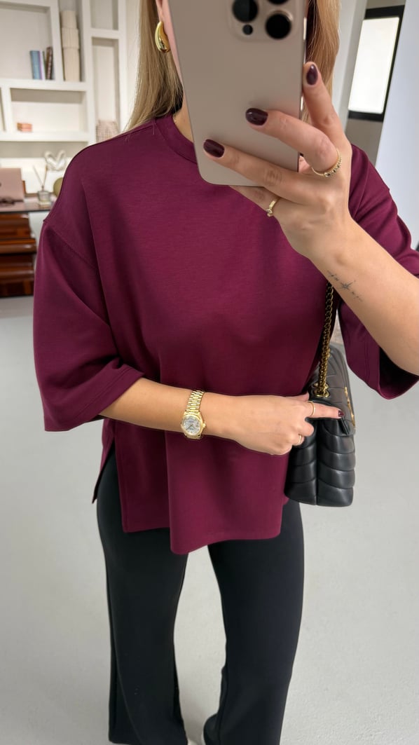 Yırtmaç Detay Oversize Bordo Tok Modal Basic Tshirt