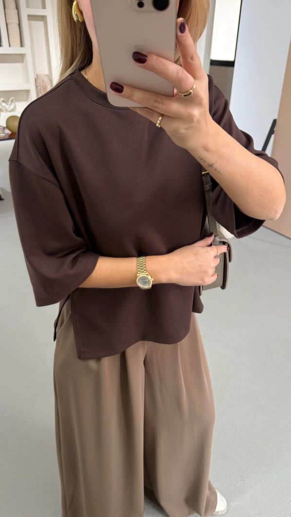 Yırtmaç Detay Oversize Kahve Tok Modal Basic Tshirt