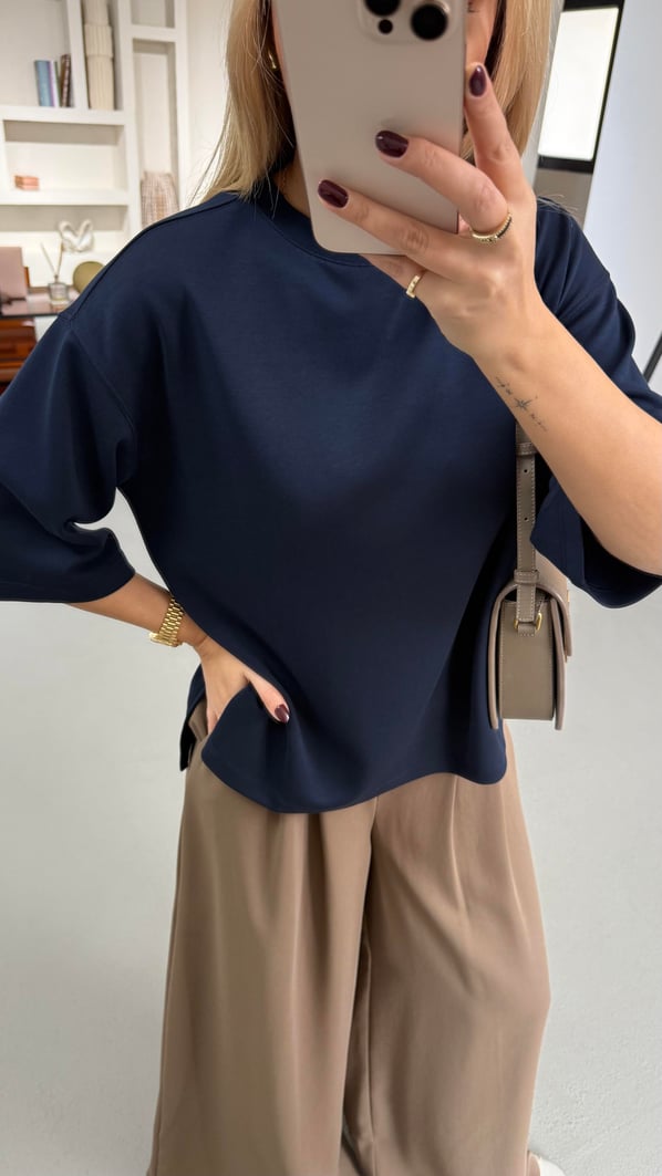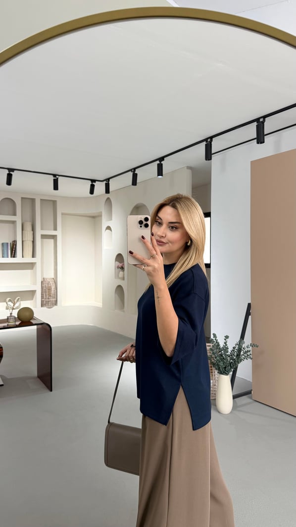 Yırtmaç Detay Oversize Lacivert Tok Modal Basic Tshirt