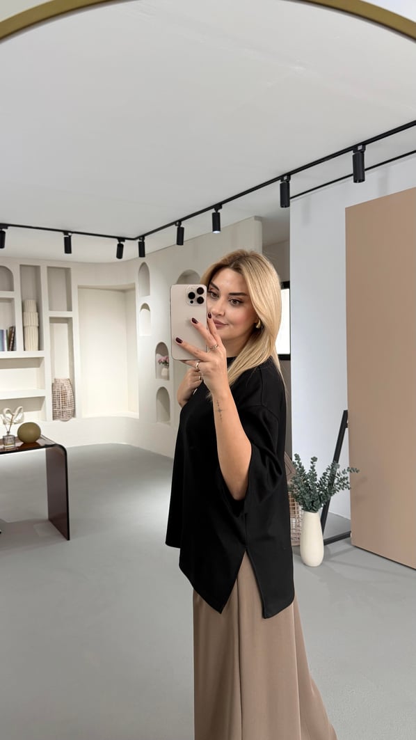 Yırtmaç Detay Oversize Siyah Tok Modal Basic Tshirt